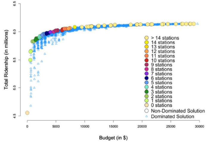 We propose a bi-criteria formulation, which is composed of two competing objective functions seeking to maximize the total ridership and minimize the total budget allocated. Demand is formulated using the random utility maximization method with variables including access time and travel time. The transit station location problem of this study is formulated using mixed integer programming and we propose a heuristic solution algorithm to solve large-scale instances which is inspired by the problem context. The elastic demand is integrated with the optimization problem in an innovative way which facilitates the solution process. The performance of our model is evaluated on two test problems and we carry out its implementation on a real-world instance. Due to the special shape of the Pareto front function, significant practical policy implications, in particular budget allocation, are discussed to emphasize the fact that the trade-off between cost and benefit may result in large investments with little outcomes and vice versa.